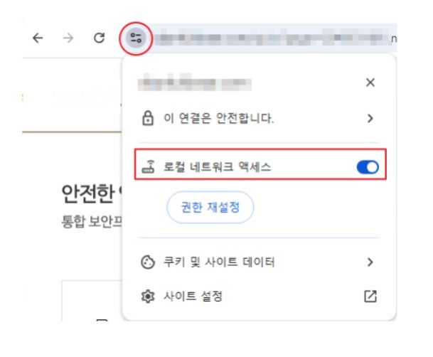 주소 표시줄 좌측의 아이콘(위 이미지 동그라미 부분)을 클릭하여 로컬 네트워크 액세스를 ON 합니다.