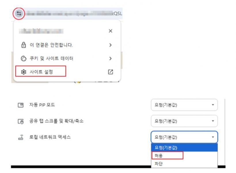 만약 로컬 네트워크 액세스 옵션이 보이지 않는 경우 사이트 설정을 클릭한 후 하단의 로컬 네트워크 액세스를 허용으로 변경해 주시기 바랍니다.