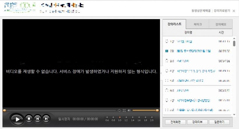 2. 강의 등록 오류로 재생이 되지 않는 경우 : 다른 강의를 클릭하여 잘 나오는지 확인 후 오류 메시지가 나오는 강의명을 기재하여 문의게시판에 문의 주시면 확인하여 조치하겠습니다.